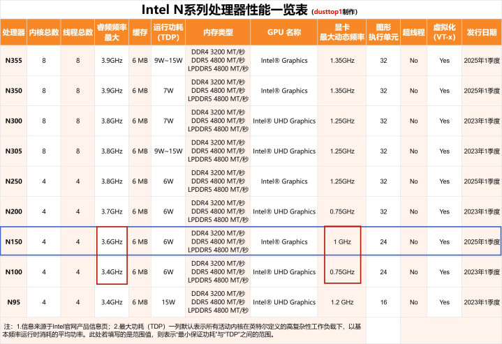 铁威马在F4-425Plus上,把烂大街的N100更新为N150。在6W功耗不变的情况下,最大睿频频率从3.4GHz提升至3.6GHz,集成显卡核心频率也从0.75GHz提升至1GHz,这都得益于Twin Lake新架构和Intel 7新制程工艺带来的性能红利。