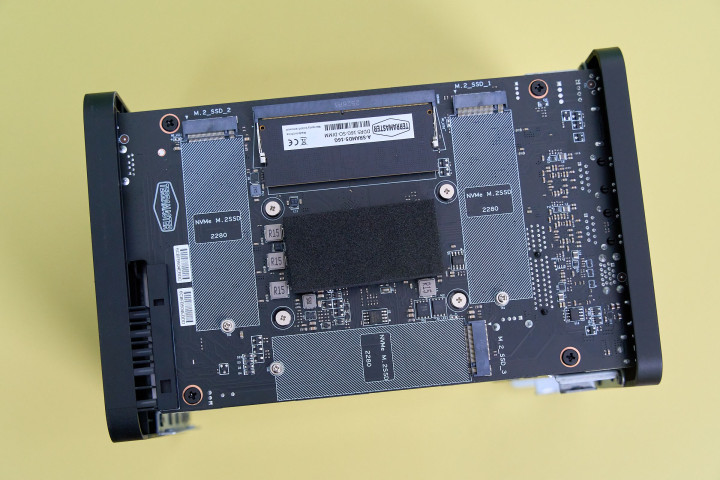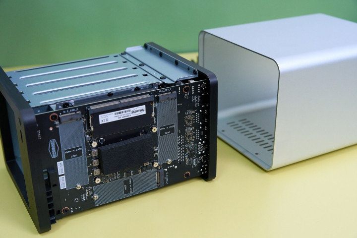 铁威马首创3个M.2盘位,就首发在F4-425 Plus上。对我来说这就是天才创新,有它之后谁还会对全闪NAS流口水?硬盘还在涨,反正我不会了。卸掉机箱底部4颗沉头螺丝,就可以抽出主板手动加装M.2固态硬盘。